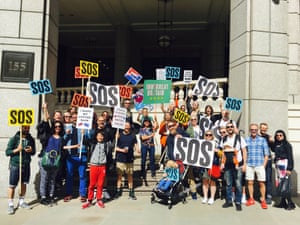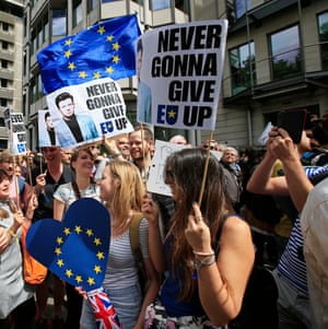 Protesters wearing EU flags as capes and holding banners saying ‘Bremain’ and ‘We Love EU’ gather in Parliament Square Photograph: Daniel Leal-Olivas/PA